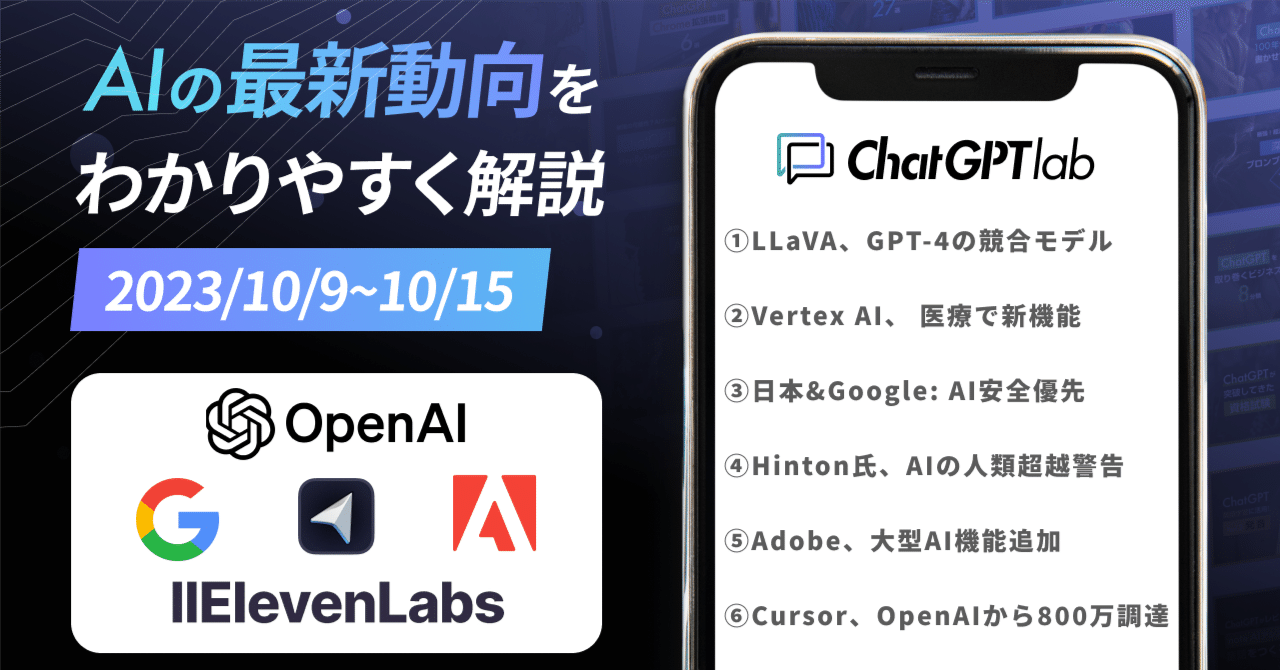 【10月9日~10月15日】今週の主要AIニュース: Google, Adobe, OpenAI, さらにヒルトン氏からの警告などを紹介#ニュース【10月9日~10月15日】今週の主要AIニュース: Google, Adobe, OpenAI, さらにヒルトン氏からの警告などを紹介2023-10-15