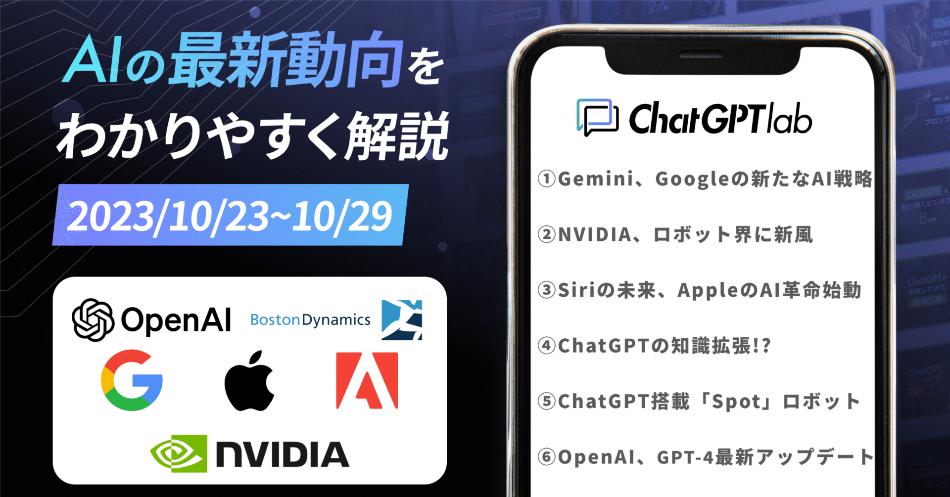 🚨今週の主要AIニュース7選: OpenAI, Google, Apple, NVIDIA...etc【10月23日~10月29日】#ニュース🚨今週の主要AIニュース7選: OpenAI, Google, Apple, NVIDIA...etc【10月23日~10月29日】2023-10-29